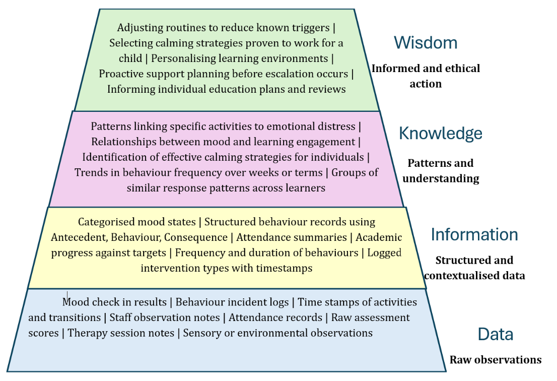 The DIKW Pyramid shows how raw educational data becomes understanding and informed action. In SEN education this progression is especially important because data is often subjective, contextual, and deeply individual.